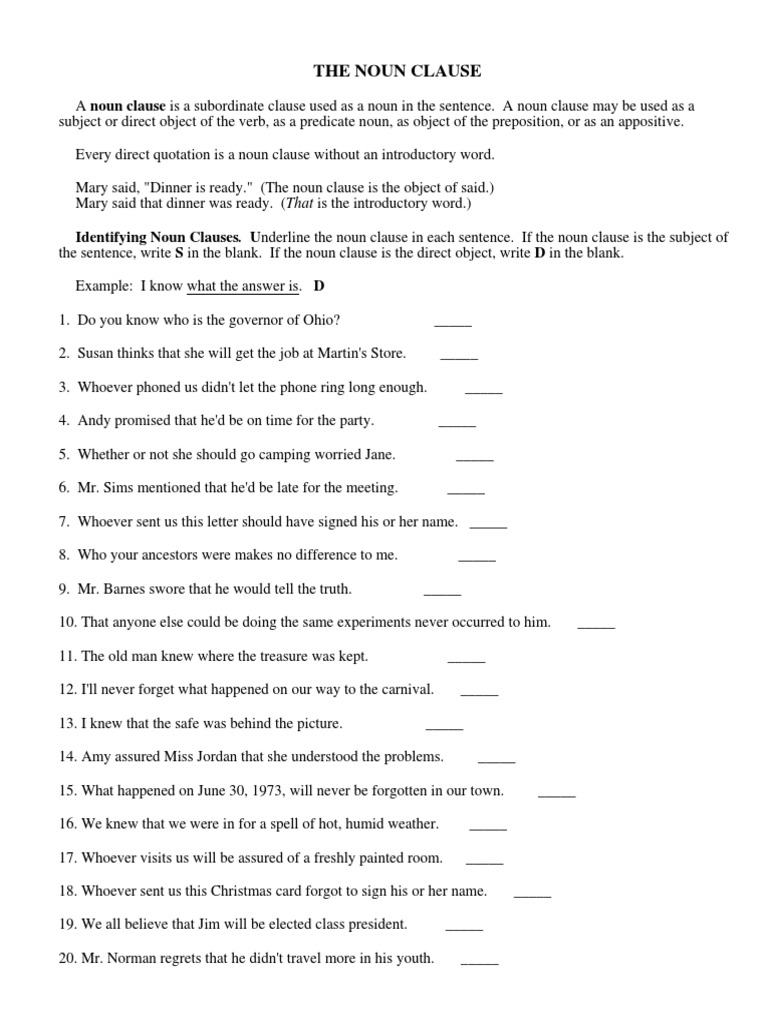 Noun clause practice, underline the clause and identify its function (do, op, pn, subject) 1. A noun is a word for a person, place or thing. Here the noun clause 'that he is not interested in the offer' is the subject of the verb is. 8) the channel gives whoever wins the quiz show a free trip to singapore. Printable worksheets @ www.mathworksheets4kids.com name :